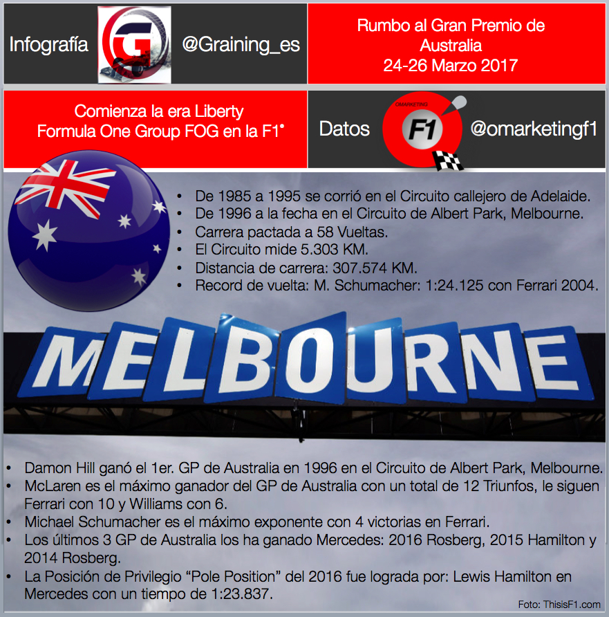 Esta será la primera carrera del Gran Circo bajo la nueva administración de Liberty Media ahora llamada “Formula One Group” (FOG) por sus siglas en ingles, quien compró la máxima categoría del automovilismo a finales del 2016, operación que fue aprobada tan solo hace unas semanas antes de que comience la primera justa del calendario 2017.