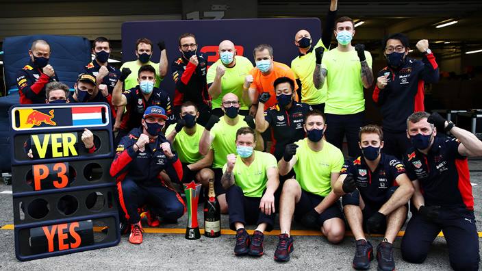 “Una vez más, Max consiguió todo lo que pudo en la carrera de hoy con otro bien merecido tercer puesto, consiguiendo su 40º podio de Fórmula 1. Después de un comienzo complicado, se acercó bastante a Lewis en el primer par de curvas, pero realmente nos costó conseguirlo. el neumático blando funcionaba, McLaren los calentaba instantáneamente y pasaba a todos. Max tuvo suerte de no sufrir daños en el incidente de carrera con Sergio y desde allí pudo mantenerse en contacto con los líderes antes de cambiar al neumático medio. que resultó ser el mejor neumático en la asignación de hoy”.