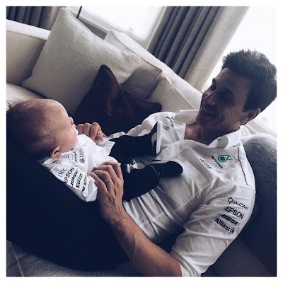 Toto Wolff, el jefe de la escudería Mercedes, disfruta después de la carrera con su pequeño, equipado con el mismo uniforme que su papá.